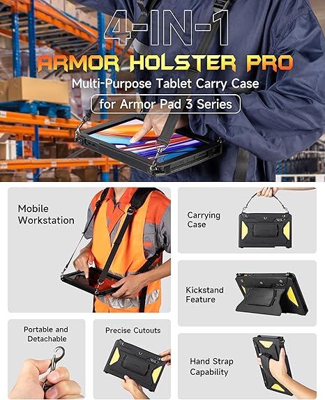 Modos de trabajo opcionales: Armor Holster Pro ofrece una solución de transporte personalizable y segura para Armor Pad 3 Pro. Con su funda de transporte portátil Kickstand y correa de mano, y la opción de usarlo como una estación de trabajo con la correa para el hombro, satisface diversas demandas.